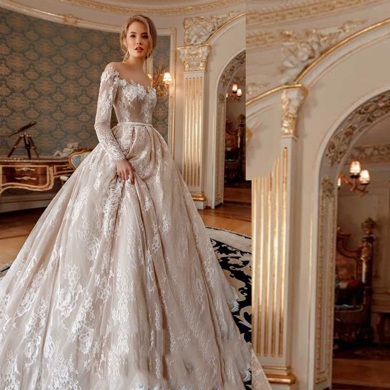 Champagne Wedding Dresses Long Sleeves Ball Gown Vintage Lace Wedding Gowns Vestido De Novia Plus Size Robe De Mariee Pearls Wedding Dresses Aliexpress